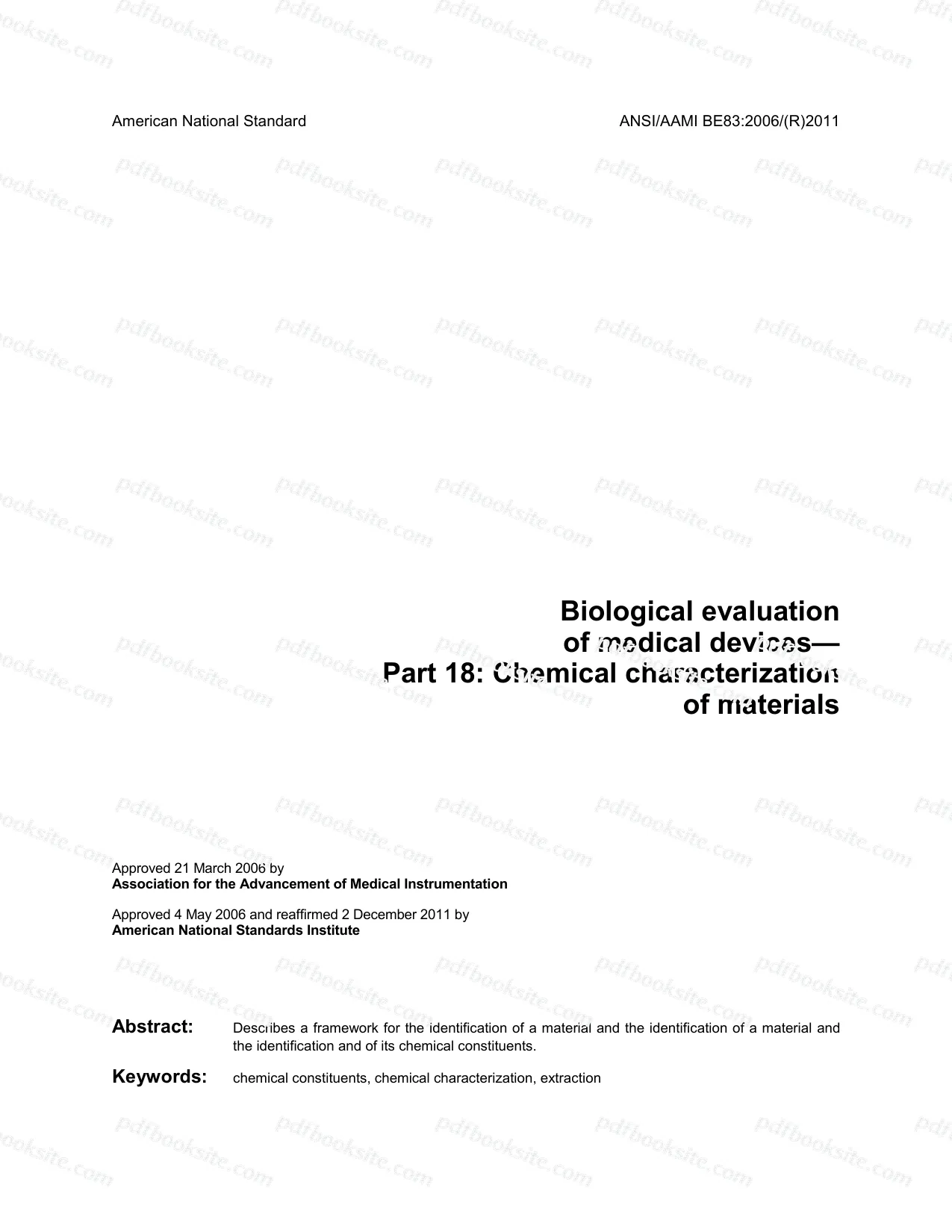 This standard, ANSI/AAMI BE83:2006/(R)2011, provides guidance on the biological evaluation of medical devices, specifically focusing on the chemical characterization of materials. It outlines the objectives and uses of AAMI standards and recommended practices, emphasizing the importance of safe and effective application of medical technologies. The document details information that should be provided with medical devices, basic safety and performance criteria, and measurement techniques for ensuring conformity. It also covers guidelines for the use, care, and processing of medical devices to maintain their performance. This standard is a valuable resource for manufacturers, purchasers, and users of medical devices, promoting responsible decision-making and patient safety. It is a voluntary standard, reflecting the consensus of healthcare professionals and industrial representatives, and should be reviewed periodically to ensure its relevance to specific needs and dynamic technologies.