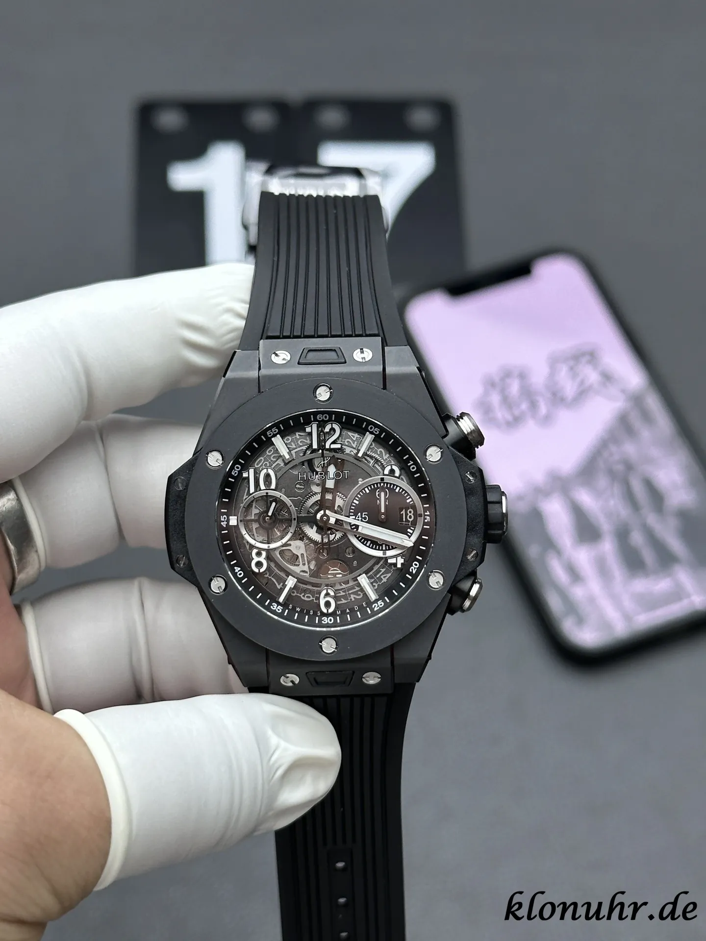 The Hublot Big Bang is renowned for its bold design, innovative materials, and exceptional craftsmanship. This particular model boasts a striking black aesthetic, combining a robust case with a comfortable and stylish rubber strap. The skeleton dial offers a glimpse into the intricate mechanics within, showcasing the watch’s precision engineering.